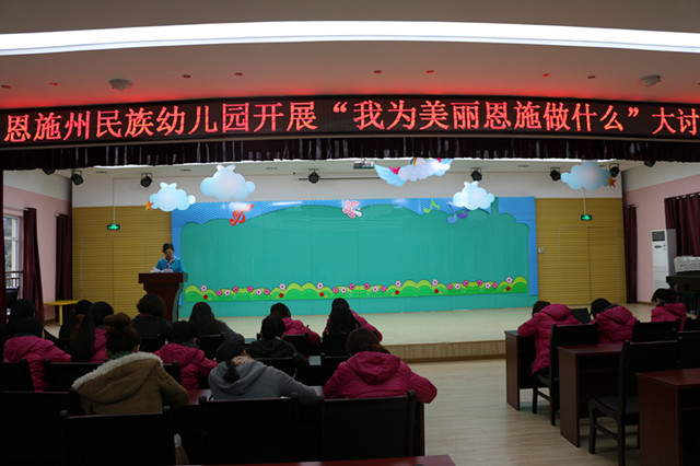 为了贯彻州委六届七次全会精神,使“推进生态文明、建设美丽恩施”的决定能落到实处。2014年11月14日,恩施州民族幼儿园积极开展了“我为美丽恩施做什么”的系列活动:
