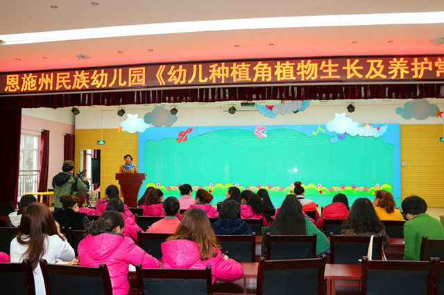 3月18日,恩施州民族幼儿园特邀恩施州农科院蔬菜研究所的专家一行六人来园进行食品安全及有机农作物栽培知识培训。培训活动中,山东星火计划专家陈教授带来有机农作物果实让教师们品尝,并从农作物分类、什么叫有机食品、绿色食品、无污染食品等方面进行了详细讲解;陈教授针对如何在本园栽种出成活率高的有机农作物,让幼儿体验成功的乐趣方面重点进行了知识传授。讲座结束后,陈教师亲临班级种植区域,手把手指导教师种植,老师们兴趣盎然热情高涨,纷纷表示要及时利用阳春三月大好种植时光,带领幼儿共同学习种植培育植物,让幼儿园充满绿色、生机盎然。