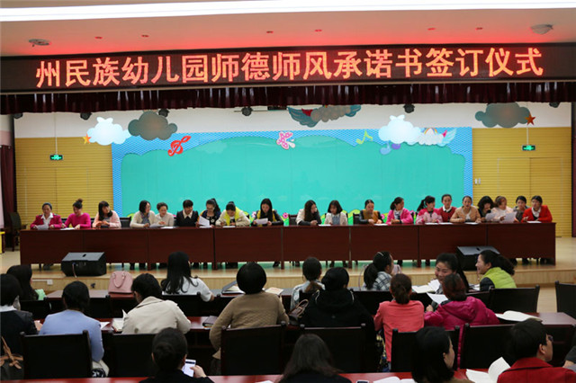 3月25日,全园召开《师德师风建设月宣传活动》,会上教职员工认真学习幼儿教师职业道德与修养重要内容,强化师德师风内容,增强“幼儿为本、师德为先、能力为重、终身学习”的教育观。会后,全体教职工签订了“州民族幼儿园师德师风承诺书”,努力塑造新一代良好幼儿教师形象。