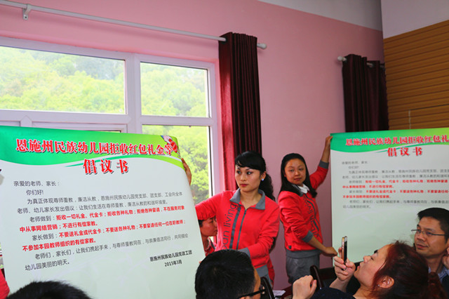 会上,曾静园长首先就幼儿园党风廉政建设和教师师德师风建设工作进行了介绍和汇报,指出“严明政治纪律,严守政治规矩”在教师群体的具体表现为:遵守职业道德规范,廉洁从教,耐得住寂寞,守得住清贫,为倡廉崇洁严守道德底线。魏迎春副园长向大家介绍了本园“一日生活皆课程”的教育理念,帮助家长转变小学化超前教育倾向作出科学指导,并将本园“打造书香校园、倡导全员阅读”方案作了详细介绍。李蓉副园长就幼儿园食堂大宗物品采购公开招投标事宜向家长进行汇报。最后幼儿园家长代表和教师在“州民族幼儿园拒收红包礼金倡议书”上签名,纷纷表示将共同为建设幼儿园良好师德师风氛围作出努力。