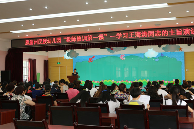 8月28日,恩施州民族幼儿园全体教职员工集中贯彻学习了州委书记王海涛在全州中小学校长培训班上的讲话精神。州民族幼儿园园长曾静担任主讲老师,为我园教师上了开学第一课。