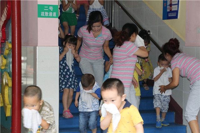 随着消防警报的拉响,幼儿园消防应急指挥部的工作人员迅速各就各位,通讯联络组迅速拨打“119”火警电话,各班幼儿在教师的引导下,用湿毛巾捂住口鼻,五分钟时间全园师幼全部安全撤离教学楼,接着各班幼儿依次通过帐篷搭建的逃生通道并观看了消防安全知识展板,最后教师们进行了灭火演练。