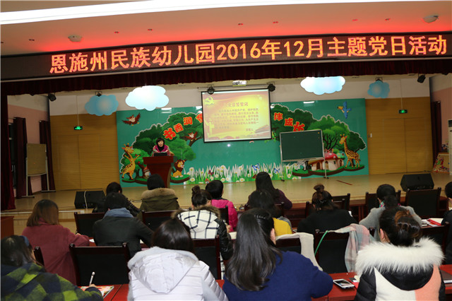 为更好的推进党建工作和开展“两学一做”学习教育,12月5日,恩施州民族幼儿园在多功能活动厅召开主题党日活动,幼儿园全体党员参加了活动,会议由副园长、支部组织委员刘萍同志主持。
