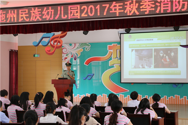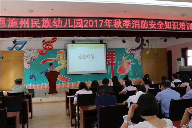 2017年9月7日,我园特邀请恩施市黄石桥消防中队官兵来园开展了消防安全知识培训、应急疏散演练和灭火演练等消防安全教育活动。消防中队副中队长刘登从学校存在的安全隐患、校园如何落实防火责任、学校火灾的预防等六个方面进行了详细的讲解,刘副队长还根据幼儿园的工作特点,结合幼儿安全意识单薄、自防自救能力差等实际问题,深入浅出地讲解如何使用消防设施、如何正确报警、发生火灾后如何逃生等消防常识,为全园教职工上了一堂生动、实用的生命安全课,对我园开展安全知识“六进校园”活动具有指导性意义。