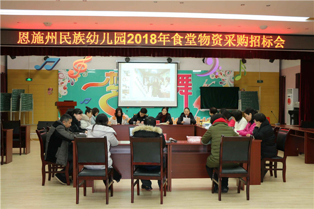 2018年1月24日,恩施州民族幼儿园进行了食堂大宗物资采购招标会。采购工作领导小组成员、园党支部纪检书记、教师代表、保健医生、食堂管理人员、家长代表等参加了会议。同时,还邀请了恩施市食品药品监督管理局舞阳食药所覃沩队长全程监督指导评标工作。