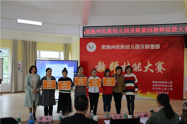 经过激烈的角逐,恩施州民族幼儿园的宋小雪老师获得了本次比赛的一等奖,恩施州民族幼儿园老师黄丽李和罗恋获得了二等奖,恩施州民族幼儿园老师郑蜜、周运丹、焦倩和恩施市龙凤坝中心幼儿教师杨荣艳,恩施市天天向上幼儿园教师陈兴华获得了三等奖。