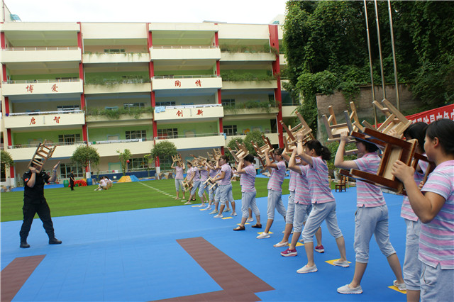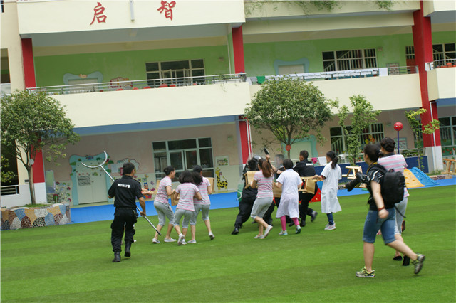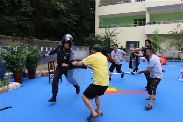 在第二部分的演练活动中,各位教官首先通过游戏及分组培训的方式让各位教师掌握应对恐怖袭击的方法与技巧,接着一名特警模拟歹徒手拿菜刀凶神恶煞地闯进幼儿园,顿时,园内警报声大作,幼儿园应急小队紧急行动,按防暴应急预案手持板凳、钢叉、盾牌等工具,将“歹徒”围住,在“歹徒”想要趁机逃跑时,大家合力,迅速将“歹徒”制服,并马上拨打110报警电话,至此,本次演练活动圆满结束。